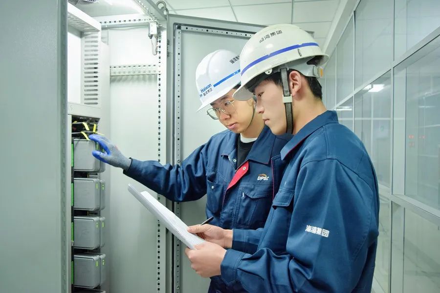 電(dian)儀(yi)部員工正在機(ji)柜間(jian)進行巡檢工作