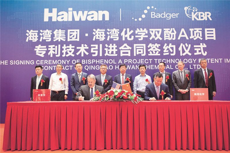 海灣化學總經理高自建代表企業與貝吉爾技術許可公司和凱洛格布朗路特公司簽署30萬噸/年異丙苯、24萬噸/年雙酚A、32萬噸/年苯酚丙酮及6萬噸/年異丙醇裝置的專利技術引進合同。出席儀式的領導、嘉賓以及新華網、青島日報、青島電視臺等10余家新聞媒體共同見證了簽約。海灣化學黨委書記、董事長鄒鐵軍主持儀式。