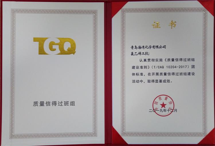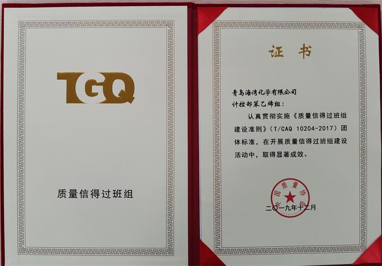 2019年12月,海灣化學氯乙烯工段(duan)和(he)計(ji)控部苯乙烯組(zu)以優異成績雙(shuang)雙(shuang)榮獲全國質量(liang)信得過班組(zu)稱(cheng)號。