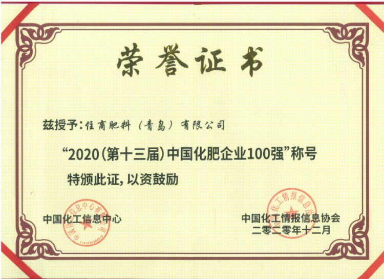 堿業(ye)發展住商(shang)肥(fei)(fei)料獲(huo)“2020中國肥(fei)(fei)料企業(ye)100強”稱號