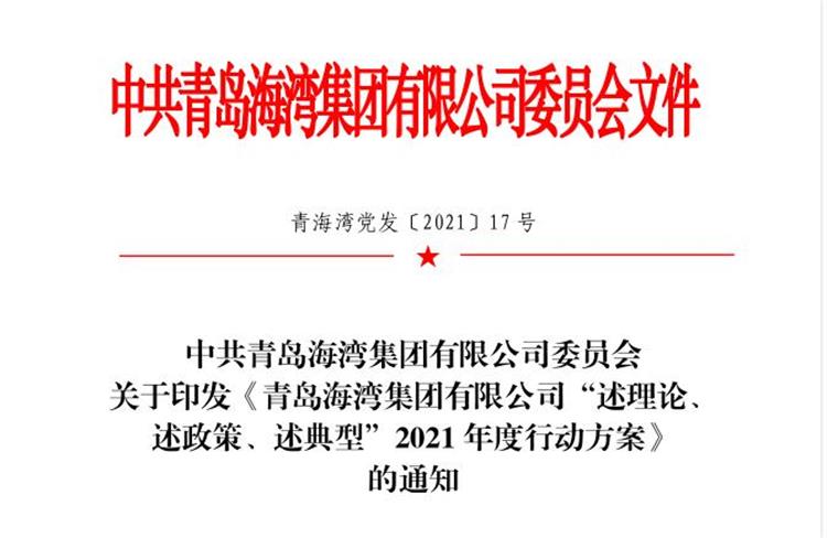 為持續推動“三述(shu)”工作常(chang)態化規(gui)范化制度化,4月7日,集團(tuan)黨(dang)委制定下發《青島海灣集團(tuan)有限(xian)公(gong)司“述(shu)理論、述(shu)政(zheng)策(ce)、述(shu)典型”2021年度行動方案(an)》。